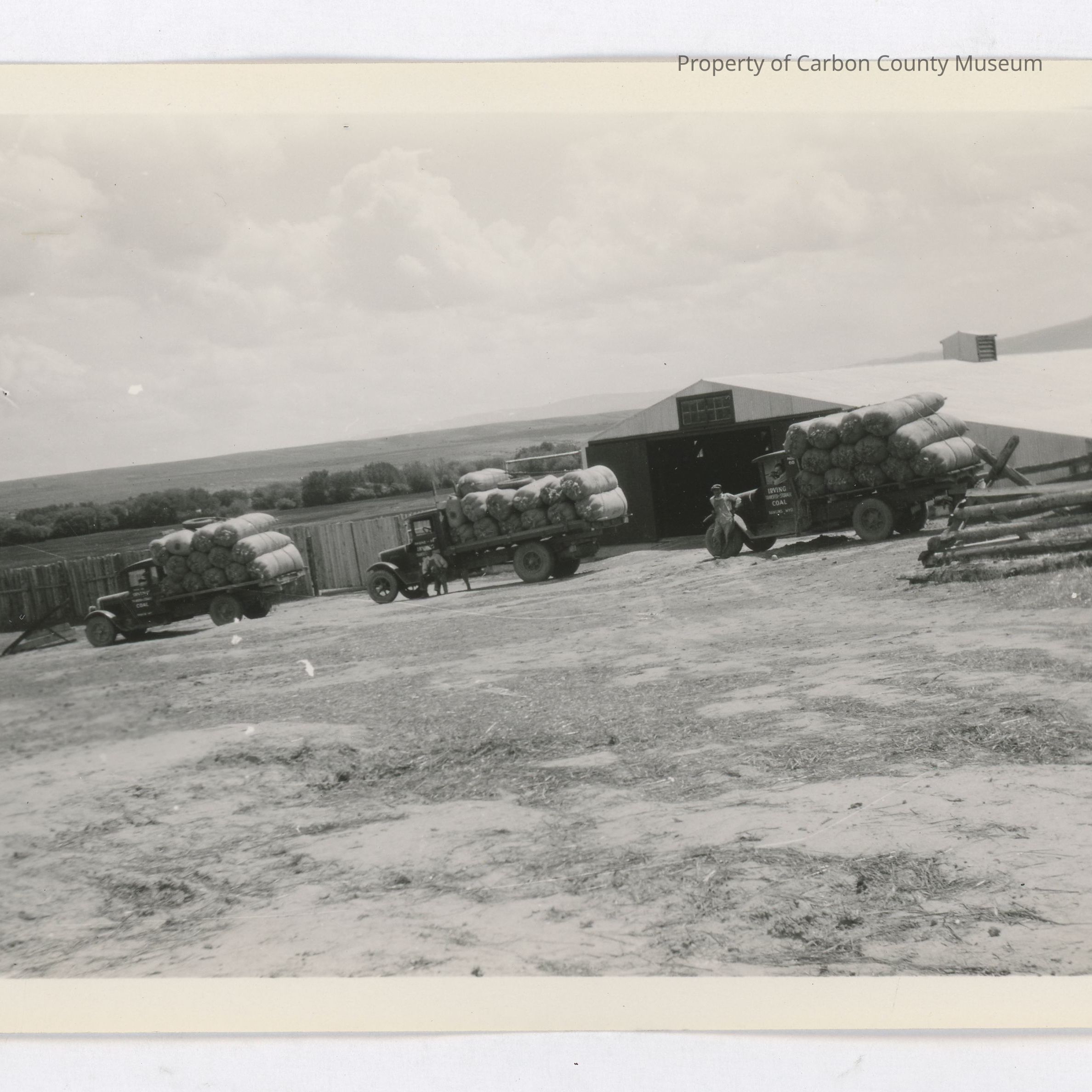 Four flat bed vintage trucks all loaded with large bulging sacks. Man standing beside third and fourth trucks in the line. Painted on door of three trucks: "Irving Transfer & Storage" "Coal" "Rawlins, Wyo." In the background is large, long building with three ventilation chimneys having roof and louvers on sides, and large doors in end. A vertical solid wood fence is attached on sides of building. Corral on photo right. Condition good. Scratched. Size 3 1/2 x 5 3/4.Collection