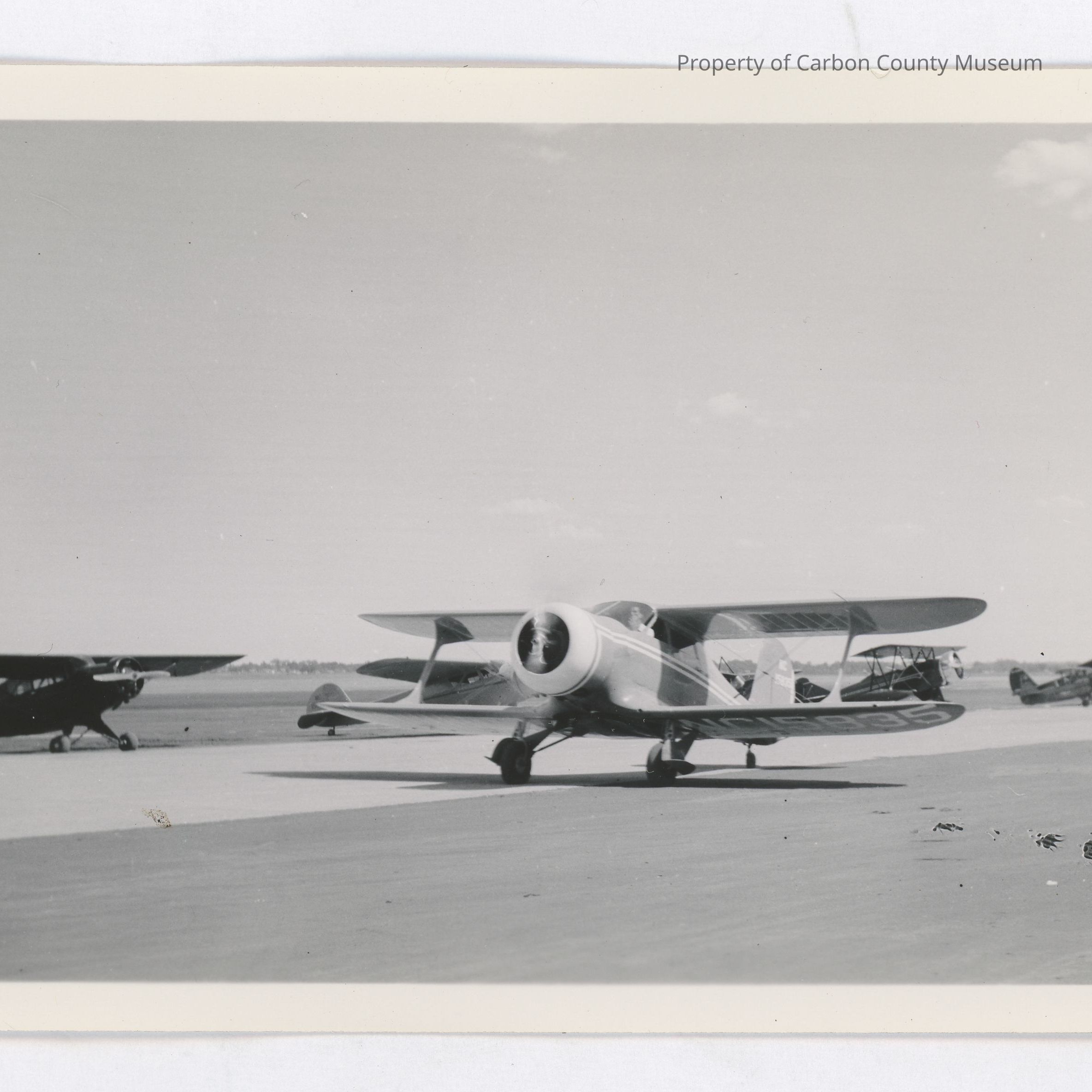 Update 2008: Black and white print, snapshot. Image of a bi-plane (two-winged aircraft) taxing on a runway with other plane (single winged and bi-planes) parked in background. Number painted on underside of bottom left wing: "NC 15835".