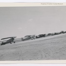 Update 2008: Black and white print. Snapshot. Image of a line of planes, single wing and bi-planes (two-winged) aircraft, parked along the side of a runway. Airport buildings can be seen in the background at right. Dirt field in foreground.