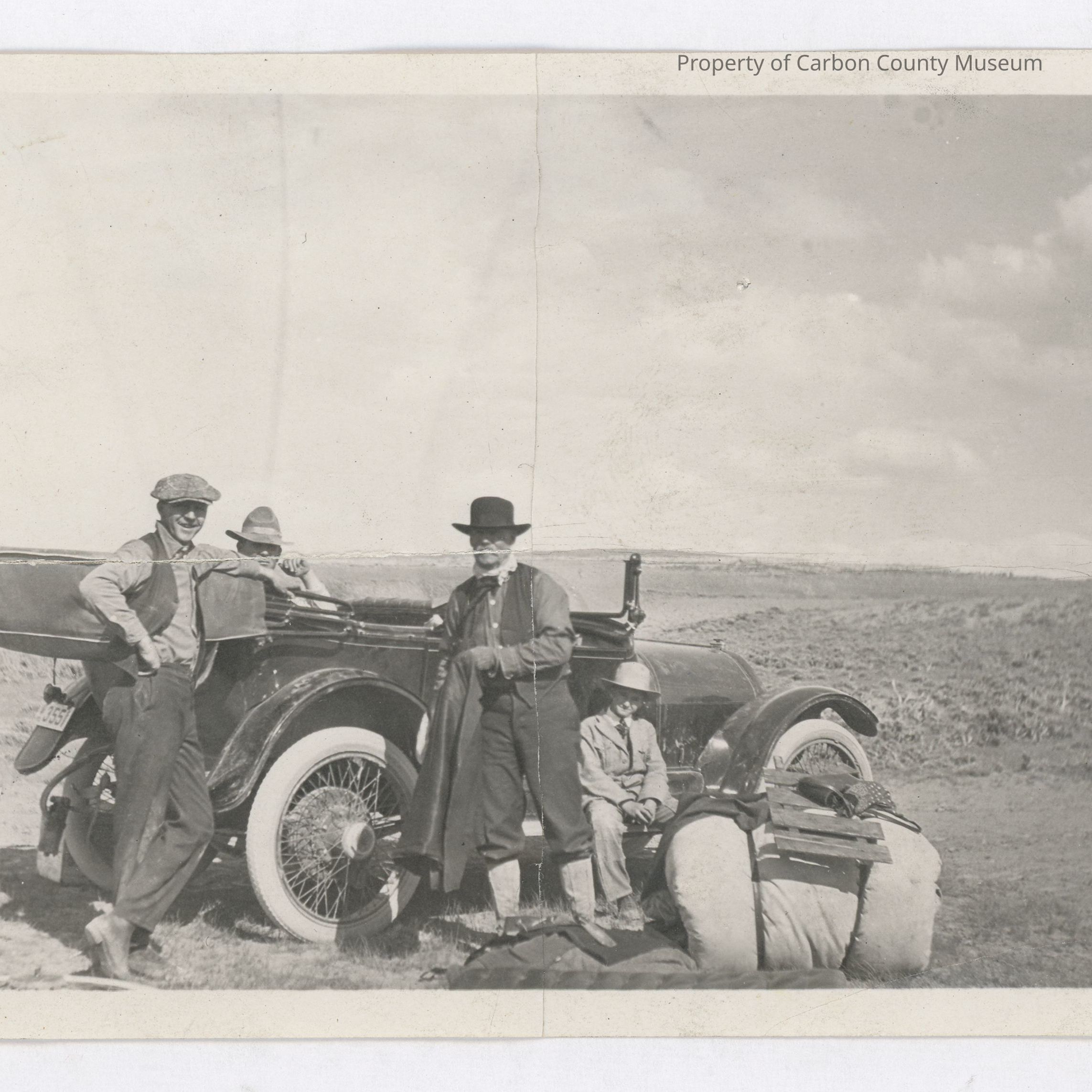 Update - Aug. 2010: Black & white print of four men beside a vintage car. Man on photo left is leaning on back of the car with his left arm out stretched on car & his left leg crossed in front of right. One man stands behind the car. A young boy sits on the running board. Another man in photo center holds his jacket. A large rolled tarp looking bundle is beside the car.