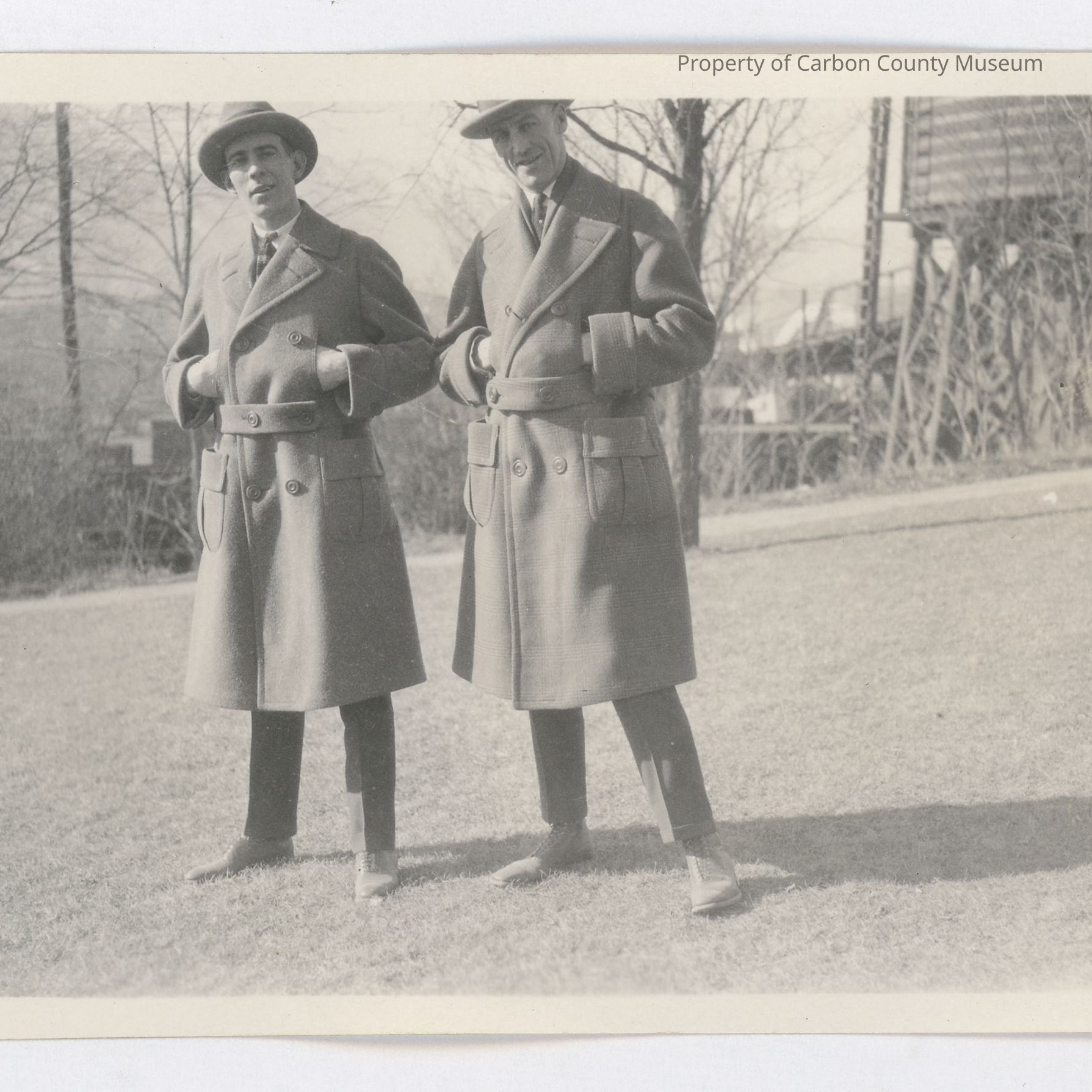 Update 2009: Black and white print of two men standing on grass. Both men wear heavy weight coats with double row of buttons and belts. They both have their hands in the coat pockets. They also have on hats, dark slacks and lace up shoes. in the background is a large tank with ladder up the side. Written on back in blue ink: "Revelle McMicken". Condition good. Scratched and creased left bottom to side.Collection