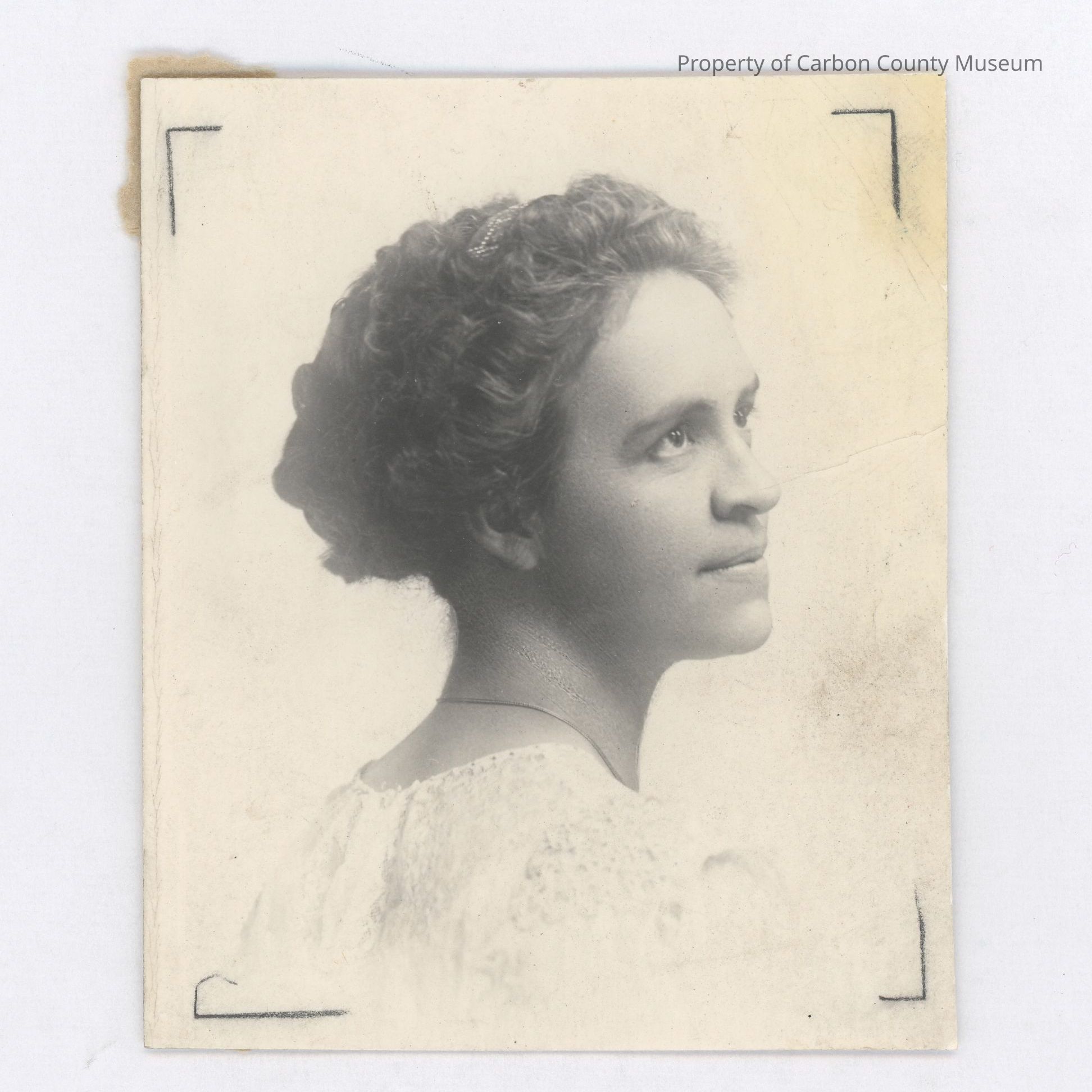 Update 2009: Black and white studio print of head and shoulders of lady. A right profile of lady, her hair is curly and upswept to the back of her head. A comb is on top of her hair. She is wearing a light colored lace dress with round neckline and has on a band necklace. Written on back in pencil: "Mrs. Boyd". "120 screen oval". Pencil marks on print front on all corners in an L shape. Condition good. Creased, soiled, adhesive and paper on corners on back from previous mounting.Collection