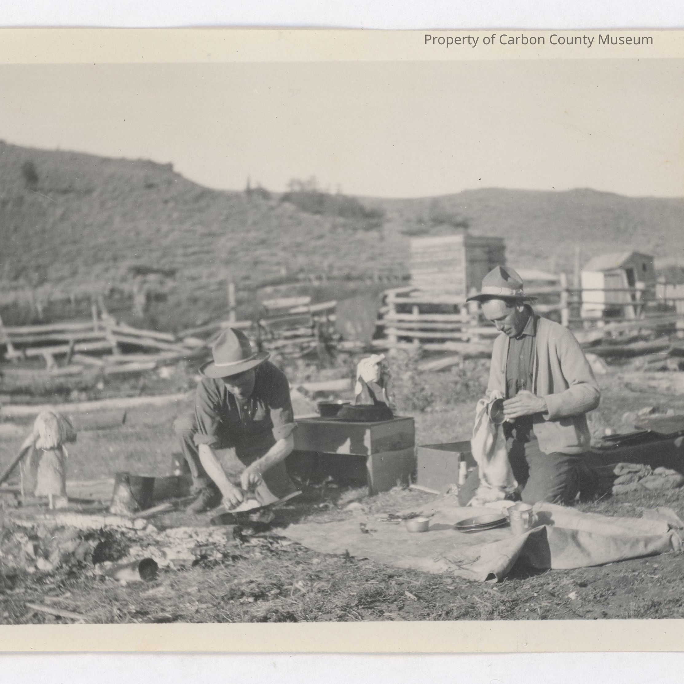 Update - 2009: Black & white print of two men kneeling on ground washing & drying tin dishes. There is a ground covering & man on left is washing in a frying pan while man on right dries & places dishes on covering. There is a towel hanging on a post, pans on a low stand behind men, box, bucket & remains of open fire by men. Background is a corral & two small outbuildings.