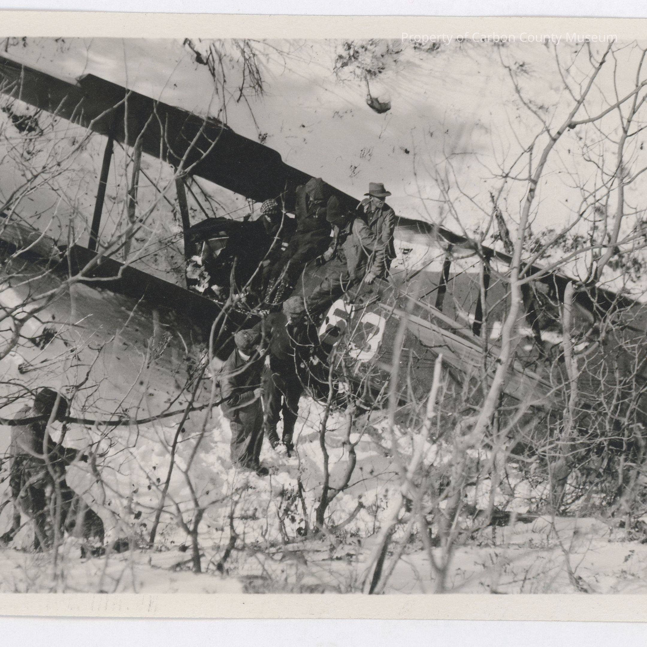 Update 2008: Black and white print. Snapshot. Image of the crash site of a bi-plane (two-winged aircraft) on a snow-covered hillside. Painted on the side of the plane is the number "63". Seven men are in and around plane. Bare trees in foreground.