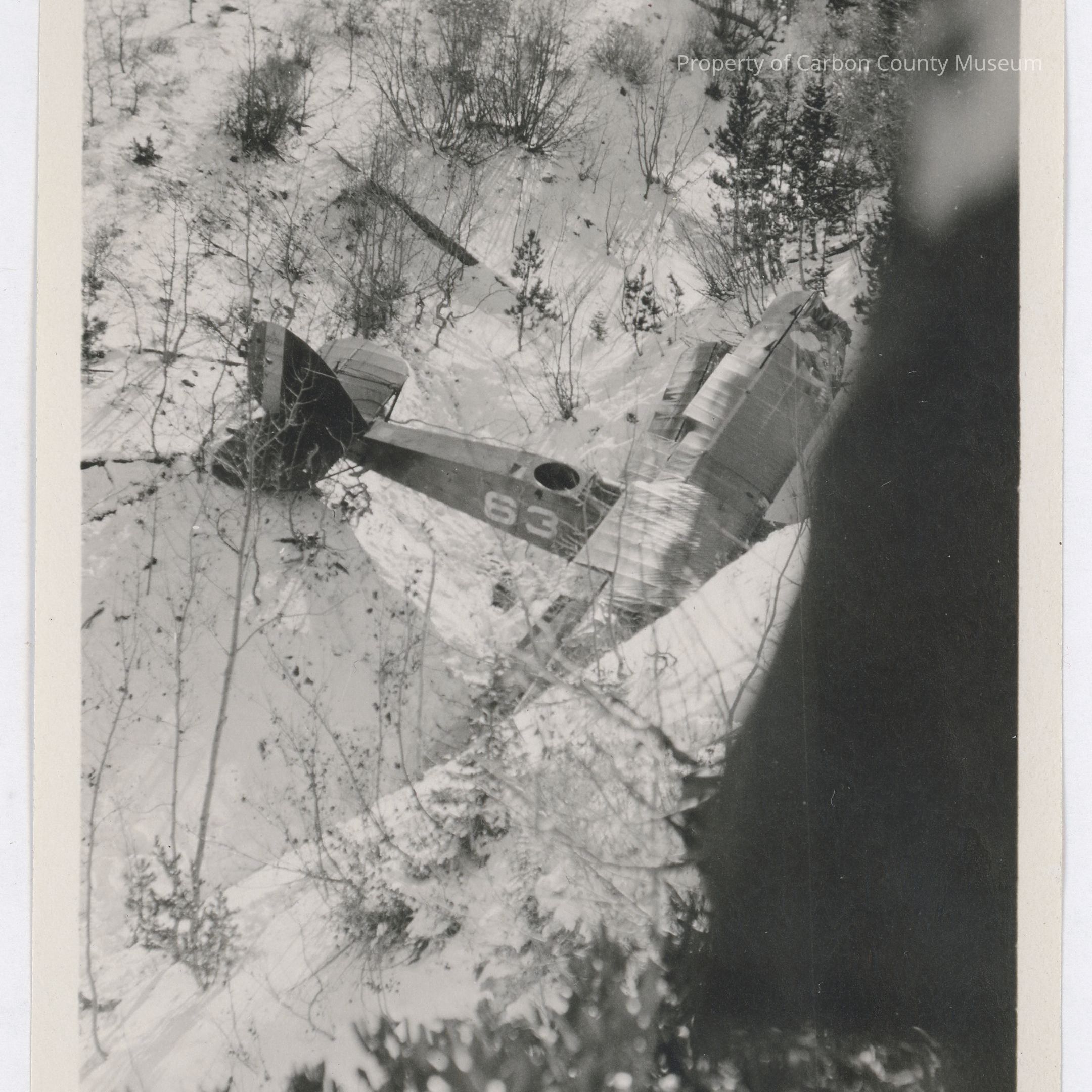 Update 2008: Black and white print. Snapshot. Image from above crash site of a bi-plane (two-winged aircraft) in a ravine on a snow covered hill. Painted on the side of the plane is the number "63". Bare trees and shrubs on hillside, forested on top.