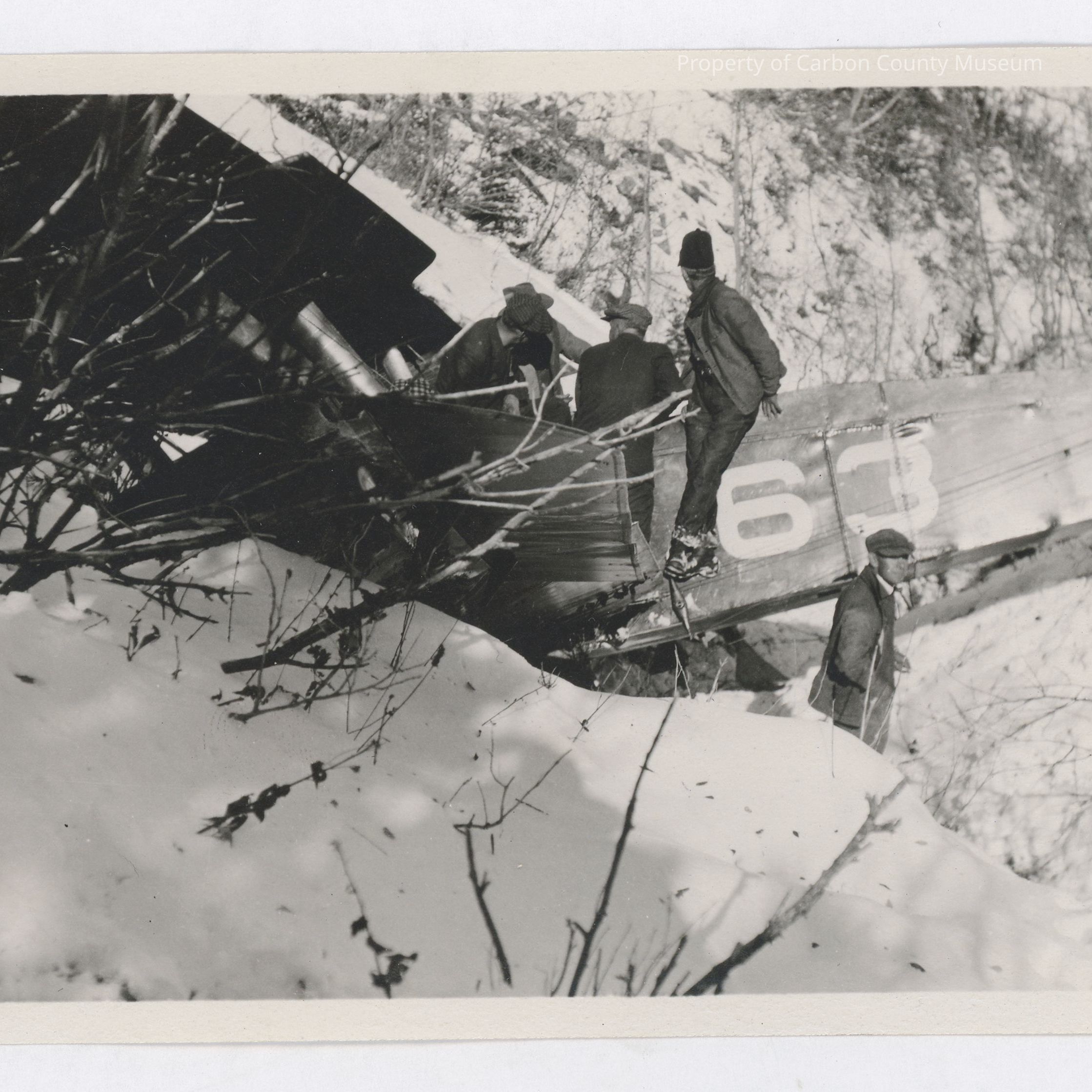 Update 2008: Black and white print snapshot. Image of the crash site of a bi-plane (two-winged aircraft) on a snow-covered hillside. Painted on the side of the plane is the number "63". Five (maybe six) men on and around plane. Bare shrubs in foreground left.