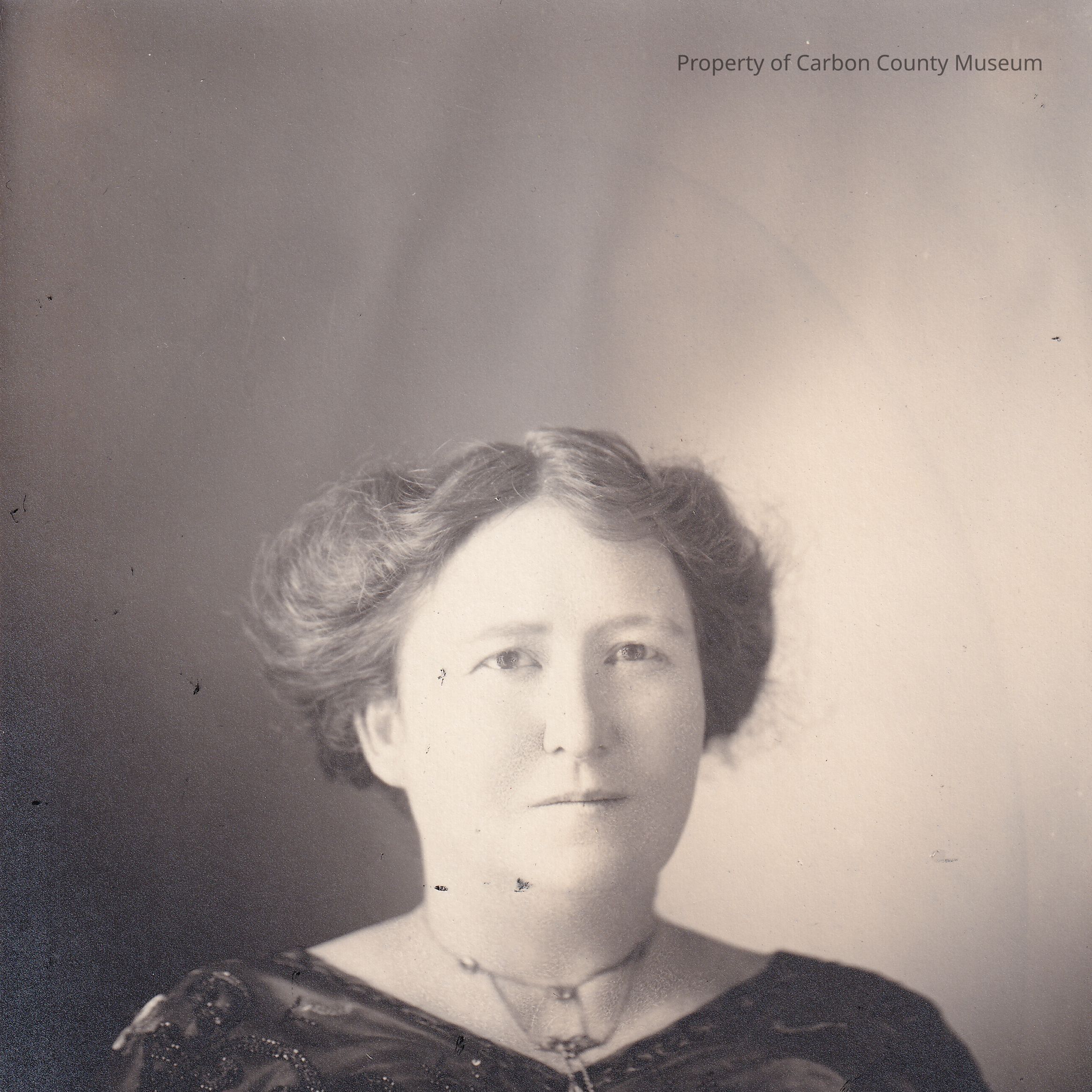 Black and white studio portrait of a woman wearing a dark outfit. Residual of backing present on he reverse.