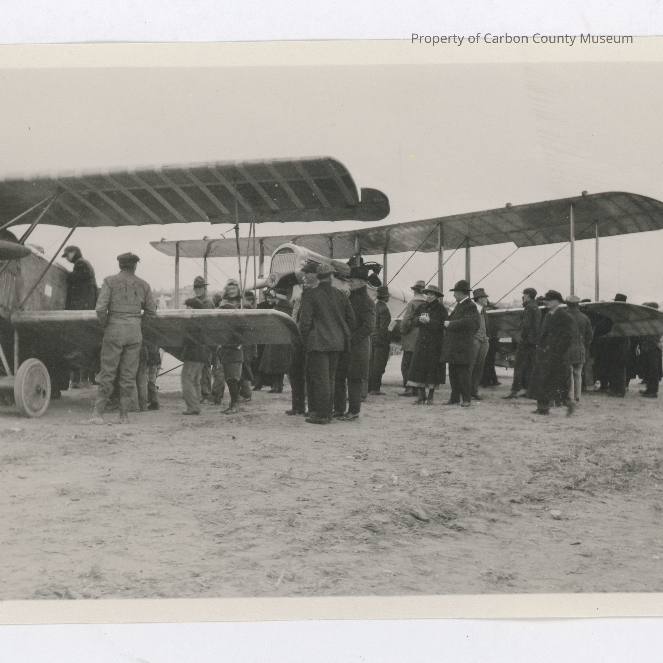 Update 2008: Black and white print, snapshot. Image of a large group of people gathered around two bi-planes (two-winged aircraft) pared one behind the other on a dirt field. Wood fence and houses perched on a hill in background right.