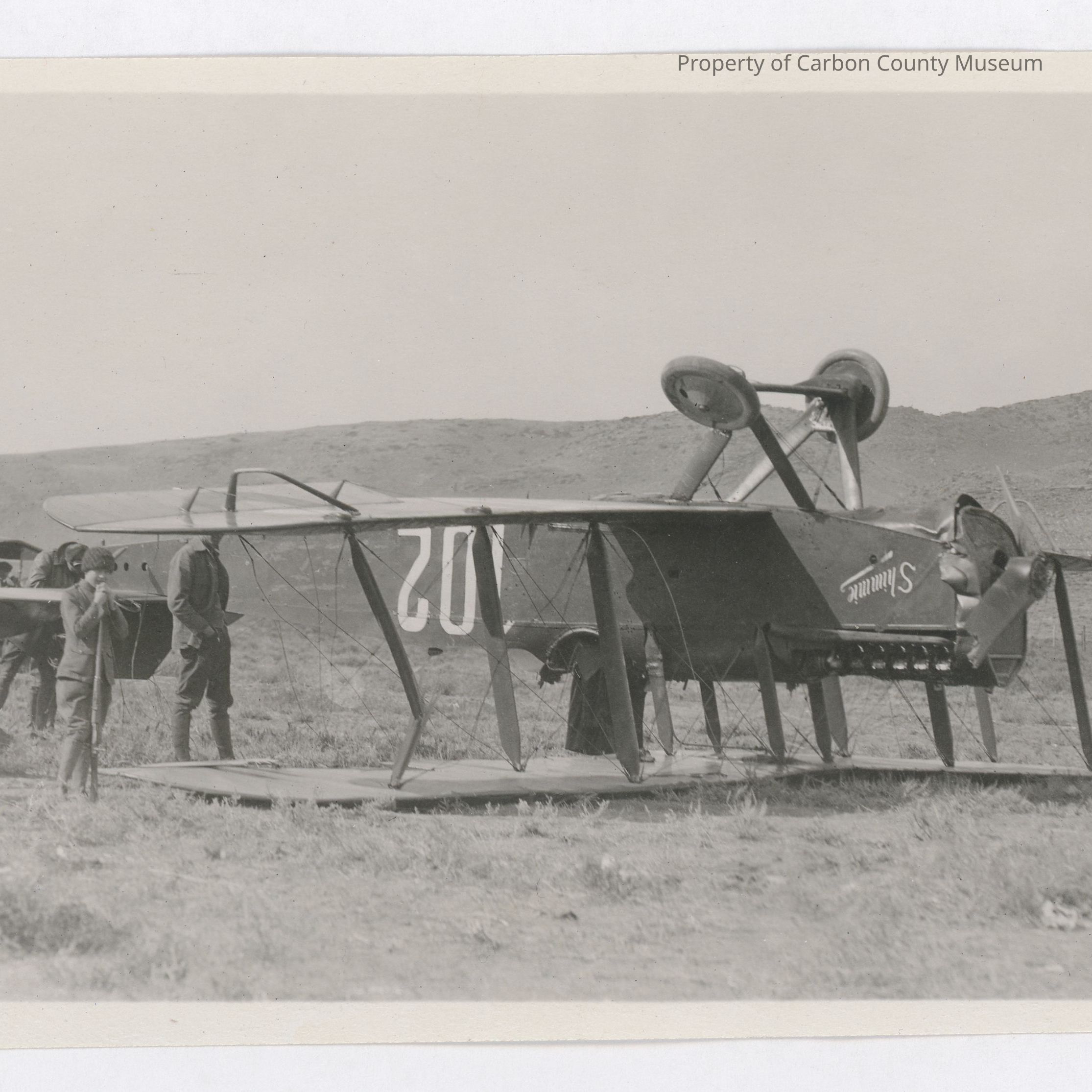 Update 2008: Black and white print, snapshot. Image of a bi-plane resting on its top after attempting to land in a field. A large group of people are gathered around assessing the situation. Automobiles and low hills in the background.