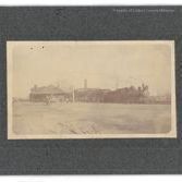 Update 2/2010: Sepia print. Snapshot. Mounted on grey matboard. Image of a steam locomotive and passenger cars(?) at a depot in the middle of the prairie. Large building with smokestack in background. large group of people standing along side train; buckboard parked near depot building. single power/telegraph/telephone pole and line connecting depot and running out of scene at right edge.