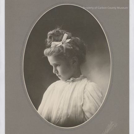 Update 2009: Black and white studio print of a young girl. A left profile with chin down. She is wearing a light colored, pleated front and sleeve chiffon dress. It has lace trim on a round stand up collar with decorative button at neck front. Her hair is brushed loosely up to the top of her head into a bun. A light colored ribbon bow is on the side of her hair. Print mounted in dark grey mat with oval opening. Engraved on bottom right corner: "Weyle & Barber Photographers Laramie, Wyo." Written on back in black ink: "Helen McMicken". Condition good. Scratched, mat soiled.Collection