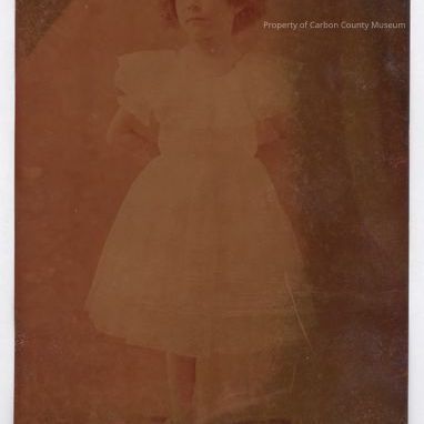 Update 2009: Black and white studio proof print of young girl standing. She is wearing a light colored knee length dress with lace and ribbon trim and ballet looking shoes. Her arms are folded behind her back. Written on back in black ink: "Helen McMicken". In pencil: "Daughter".