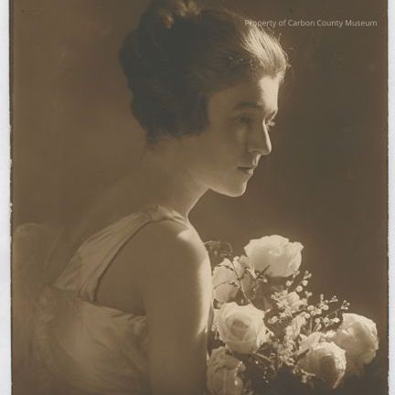 Update 2009: Black and white studio print of woman holding bouquet of roses. Right profile of woman with dark upswept hair with pinned up curls in back. Dress has straps over shoulders and pouf of netting on back. Written on back in blue ink: "Helen McMicken" "daughter".