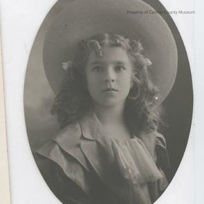 Update 2009: Black and white studio print of young lady wearing a large straw hat. She has long curly hair. Her dress has large collar with 2 pleats over shoulders. Lace cravat looking sash at neck. Oval shaped print. Written on back in blue ink: "Helen McMicken 1907". In pencil: "Daughter 13 years old."Collection