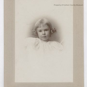 Update 2009: Black and white studio print of young girl. She has short curly hair and is wearing a white dress with pouffy sleeves and eyelet fabric. Written on back in pencil: "Helen McMicken daughter." Print is mounted on off white mat, it has embossed lines to border picture and edge of mat and in between is fine pattern embossing. Condition good. Scratched, emulsion impacted, soiled.Collection
