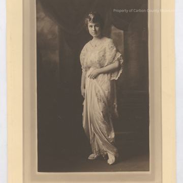 Update 2009: Black and white studio print of standing lady. She is wearing a long silky print dress. It has a V neck, dropped shoulders, elbow length sleeves, fitted skirt and fold over bottom with inset petticoat. Her shoes are slippers with a bow. Her hair is high on top with rest pulled back. A studio prop of drapes and a pillar are behind her. Embossed on bottom right corner:"Champlain Studios, 161 & 164 Tremont St. Boston." Photo printed on mat.