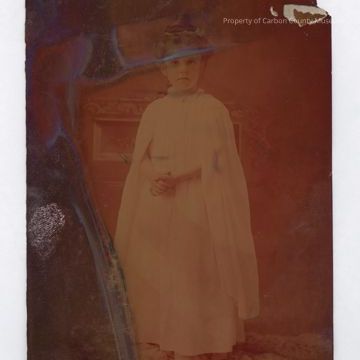 Update 2009: Black and white studio proof print of standing young girl. she is wearing a long light colored dress with cape. Her hair is pulled up to the top of her head and has a lace ribbon around bun. she is standing on a fur rug. A studio prop is behind her, it is a wood scroll mantil. Written on back in black ink: "Helen McMicken" in pencil: "daughter".