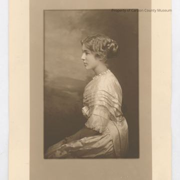 Update 2009: Black and white studio print of a lady sitting facing left. She is wearing a silky fabric dress with off the shoulder pleats on collar, sleeves to elbow with a fabric flower in front. Her hands are folded in her lap. Her hair is waved and pulled to the back of her head and pinned up. Embossed in lower right corner: "M.F. Jukes Photo". Photo printed directly on mat.