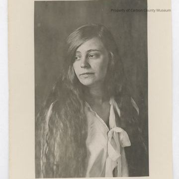 Update 2009: Black and white studio print of a lady. She has long hair and it is hangin gdown over her shoulders. She is looking down and to the left. She is wearing a lilght colored blouse with a V neck and bow tie at bottom of V.