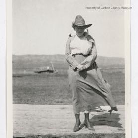 Print 2: Woman standing on boardwalk, wearing small checked jacket and skirt, white blouse and lace up high heeled boots. She has on a dark cowboy hat. The wind is blowing her skirt to one side to reveal several inches of her petticoat. Wind is also blowing up on side of her hat. Written on back in pencil: "Unknown" Condition good. Back soiled.