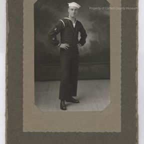 Update 2009: Black and white print in a mat folder. Image of a man in sailor uniform. He is standing with his hands on hips wearing a white hat with upturned brim and round top, dark pants and shirt trimmed with white stripes. Nay insignia on right sleeve. He is standing on a wood floor with vague photographer prop curtain behind him. Print mounted in a two toned brown folder mat. On front of folder is an embossed trademark symbol.