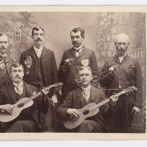 Update March 2011: Sepia print on a cream colored mat. Image of six men, four standing behind & two seated. The two in front hold guitars & have cigars in their mouths. The four behind hold cigars in their right hands & the man on the right has a full beard. The other three have mustaches. The seated man on left has a mustache & man on the right is clean shaven. They all wear suits & ties.