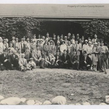 Update 2008: Black and white print Snapshot. Image of a large group of people posed on a sparse lawn in front of a vine-covered building. Large rocks in a row with antler at right in the foreground. Many of the men are wearing fezes from the Korein, Al MaLaikah, Tehannal temples. Written on the back in black ink: "Dinner in honor of Imperial Potentate at Medicine Bow Lodge by Korein Temple-I.M.Connesse Potentate." I.M.Conness Collection."