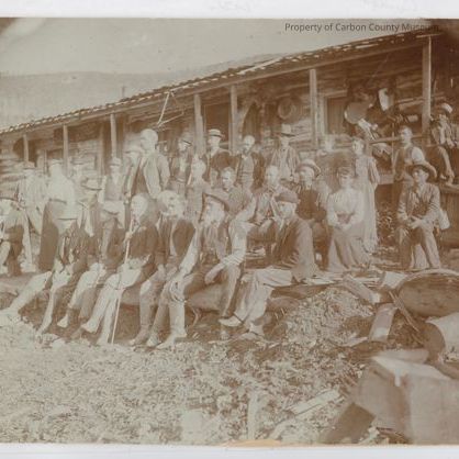 Update 1/2010: Black and white print. Snapshot mounted on tan matboard. Image of a group of men and women on the porch of a long log house. Women in dresses, men in a mixture of casual suits and shirtsleeves. Mountain background. Foreground strewn with logs, wood chips and junk.