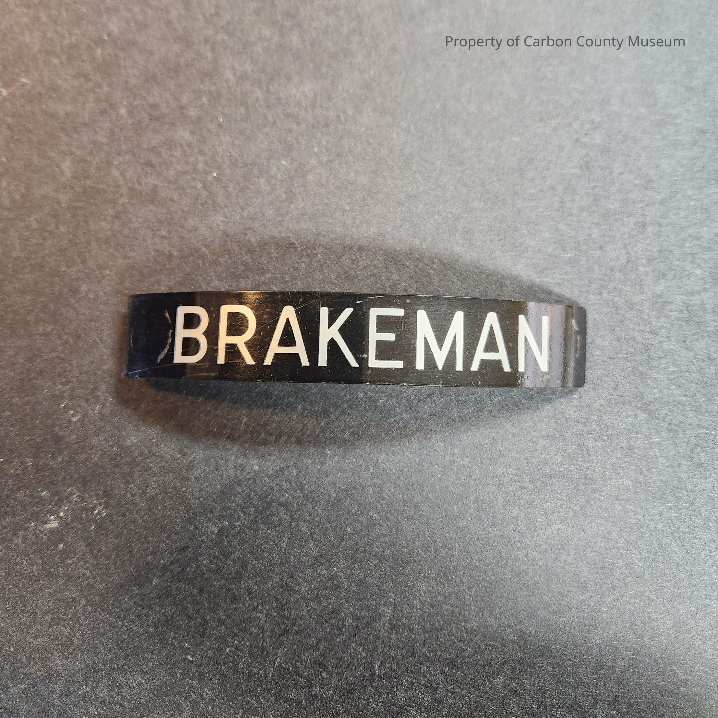 A black pin with silver lettering that reads "BRAKEMAN", would be attached to a brakeman's hat.