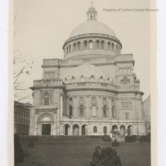 Update 2009: Black and white print of a large multi level domed building. The top of the dome is a crowned with a spire on a gazebo, at base of dome are arches all around. A parapet tops next level and at each end decorative corners commence downward. In the middle is another half dome extending out from building . A decorative wall and arch windows surround base of this dome. To either side are ornamental pillars and arches. A decorative edging around top of next level, then embossed scroll and braid surround square windows above arch windows. On lower left, a dark open area. Iron bars are across some arch openings. On photo right are steps leading up from grassy area to front where a vintage auto is parked. Foreground is lawn, bushes, and tiers up to a fence. In background on photo left is another multi level stone building. Building appears to be a Capitol.