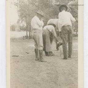 Update 2009: Black and white print. Snapshot. Image of three men and horse on a large dirt area with trees in the background. men are casually dressed in shirt sleeves. Manon right is hilding the horses reins. Man in center is holding on hoof and appears to be tying it up so it will be held off the ground. Third man at left is watching the proceedings.