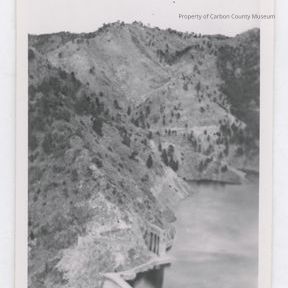 Written on back in blue ink: "Seminoe Dam spillway 1940". "22" In pencil on white adhesive label pasted to back: "Seminoe".