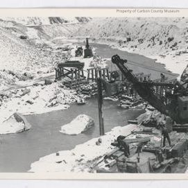 Written on back in pencil: Seminoe Dam Construction 1936-1939" Blue ink: "10" .Pencil on white adhesive label pasted on back: "Seminoe".