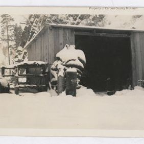 Update 1/2010: Black and white print. Snapshot. Image of a small frame open front building in heavy snow. Various snow covered parts and equipment near outside walls. Snow-covered clift and hills in background.