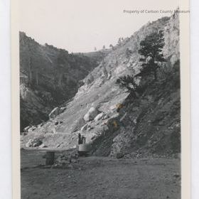 Blue ink arrow at top center on emulsion. Written on back in blue ink: "The toolly on the hi line" "1936" "Seminoe Dam".