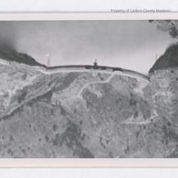 Update 1/2010: Black and white print. Snapshot. Image from above of the water behind a dam in a steep river valley. Sparsely forested slopes on either side below dam; road on far side of valley.