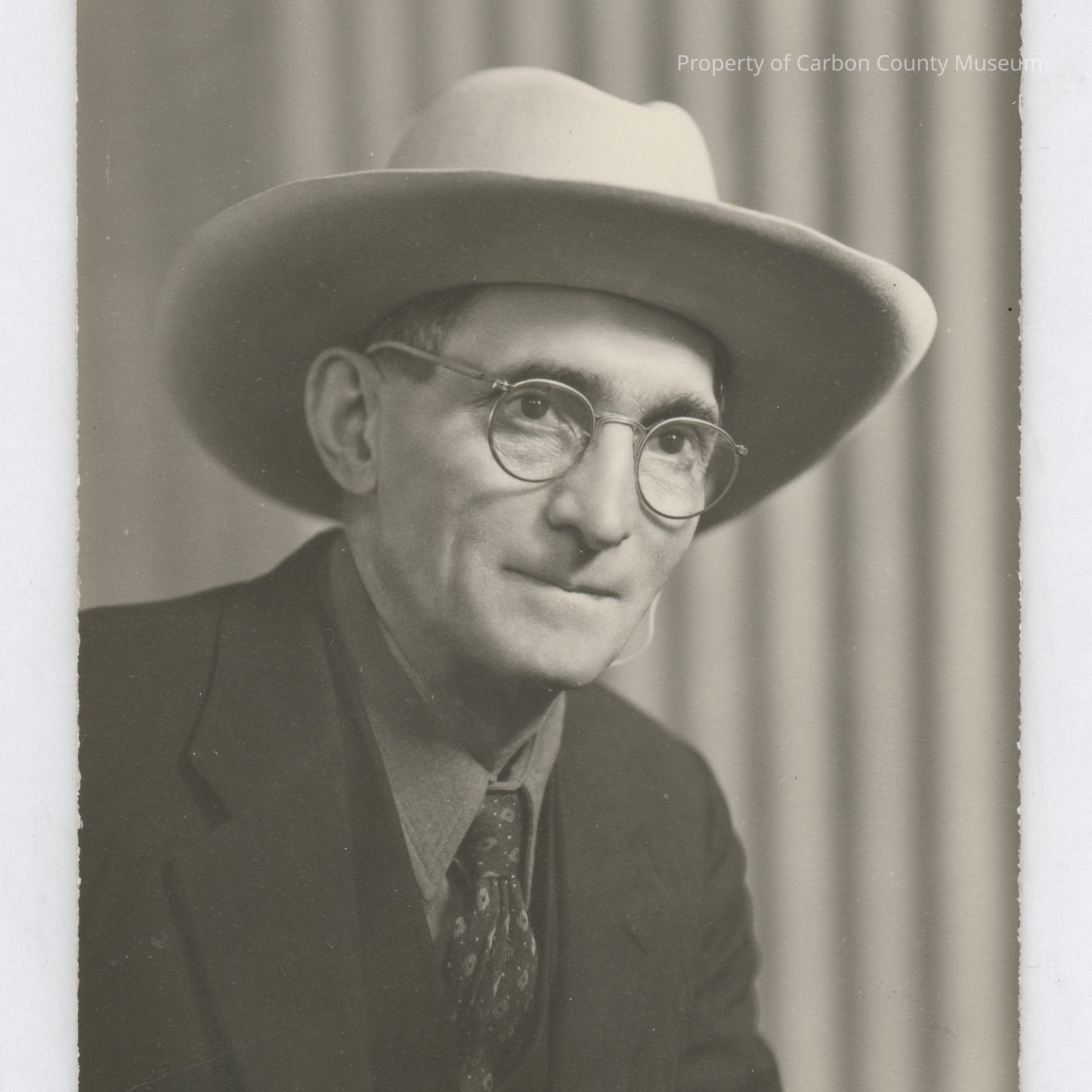 Update 2009: Black and white studio portrait of a well dressed man. He has on a dark 3 piece suit, lighter colored shirt and print tie. He is wearing glasses and has on a white, western hat. He is facing slightly to right of photo. Curtain backdrop.