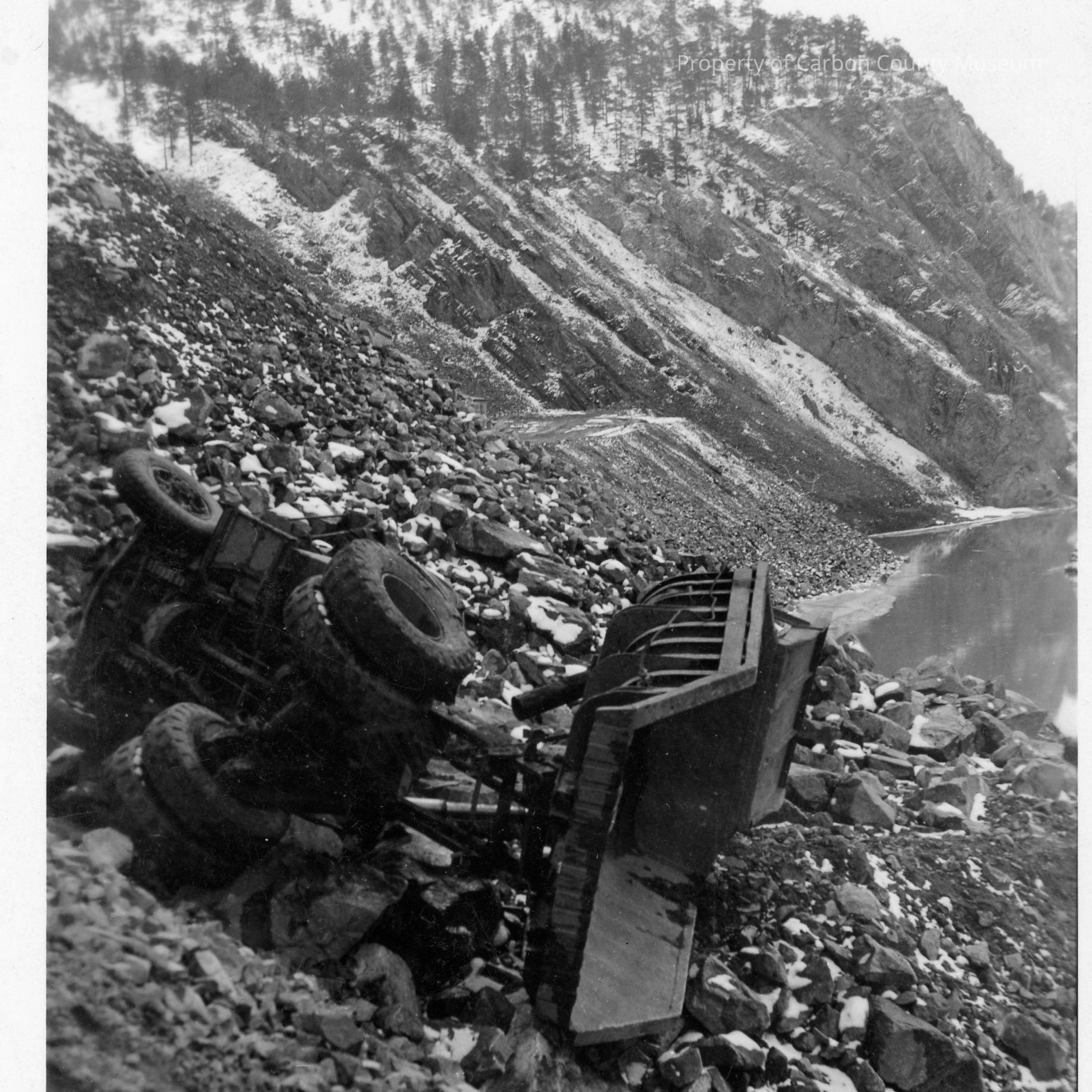 Update February 2011: Black & white print card. Image is of an overturned dump truck on a steep, rocky slope. It is laying on it's side with dump bed on it's edge & axles twisted so tires are at different angles. In the distance is a steep slope with trees near the top. Water is at the base of the slope.