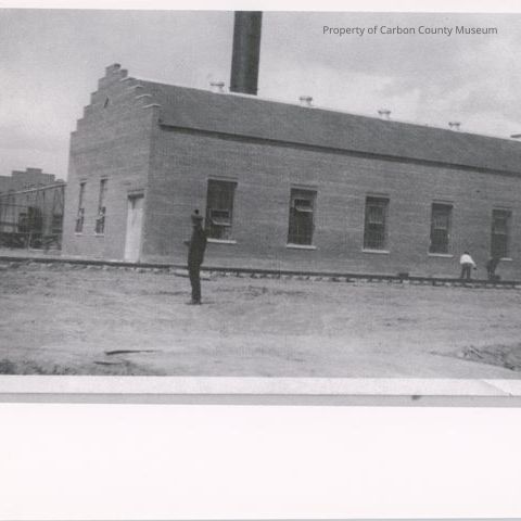 Update 5/2010: Black and white enlarged scanned copy of a brick building with tiered eaves on ends, six windows on the side, with tilt out openings. There is a walk out door and 2 more windows on photo left end. Two workers are at the side of the building and anther man stands in photo center. A pipeline on a series of metal stands is from the building to another similar one in the background.