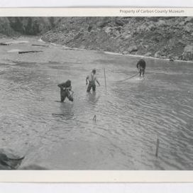 Update February 2011: Black & white print card & one scan copy. Image of three men working in a river. They form a line across the water & a cable is between them. Two men have tools in their hands. Water flows between two steep banks into the distance.