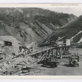 Update February 2011: Black & white print card of a piece of equipment on a ramp with a track leading to piles of timbers on a raised platform at rivers edge. Two vintage trucks are parked beside, An empty rail cart is on lower end of ramp. In the distance is a shack & steep walls on side of the river.
