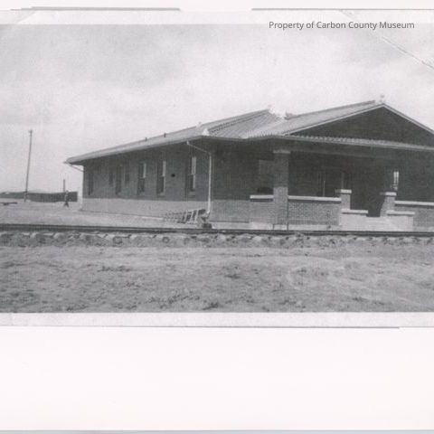Update 5/2010: Black and white enlarged copy print of brick building with a porch. Building is rectangular with tile looking roof, windows on the side, downspouts on the corners from gutters and root decorations on eave of building and porch. The porch has brick sides up an few feet and brick pillars supporting the roof. Steps go between concrete bench sides up to porch. A railroad track is in front of the building.