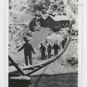 Update February 2011: Black & white print card of men walking on a suspended bridge with rope hand rails. There are approximately ten men on a snow packed bridge coming from a small building. Snow is on the roof of the building & on the slope behind & beneath. The river flows beneath the bridge.