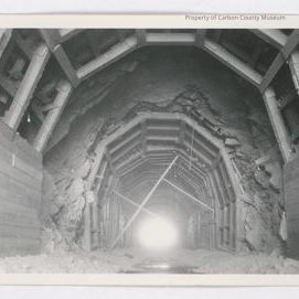 Update February 2011: Black & white print card of interior of a tunnel. Large wood timbers are on sides & overhead in an arch. rock is above timbers. A bright light is seen in the distance in the tunnel.
