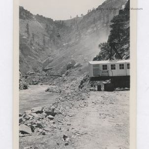 Update February 2011: Black & white glossy snapshot print. Image of a piece of equipment on photo right with a sign on side that reads: "Bucyrus Erie 120B". A suspended cage on a cable is going across canyon. The river runs between steep rocky, sparsely timbered slopes. Dust or dirt is blowing from side of canyon on photo right.
