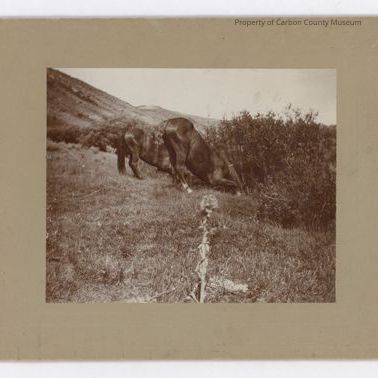 Update 2008: Sepia print. Snapshot. Mounted on tan matboard with curvilinear floral border. Image of two dark horses with butts in the air and forelegs and head down under a clump of bushes. Possibly trying to reach water in a low stream. Hills in the background and grass in the foreground. a line of bushes can be seen in the midground.