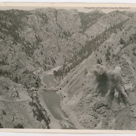 Update 1/2010: Black and white print. Snapshot. Image of blasting high on the rocky slope of a river canyon. Dust plumes from blast on right. Steep rocky and sparsely forested canyon walls. River running along bottom of canyon with frame bridge across at center. Buildings along left back of river.