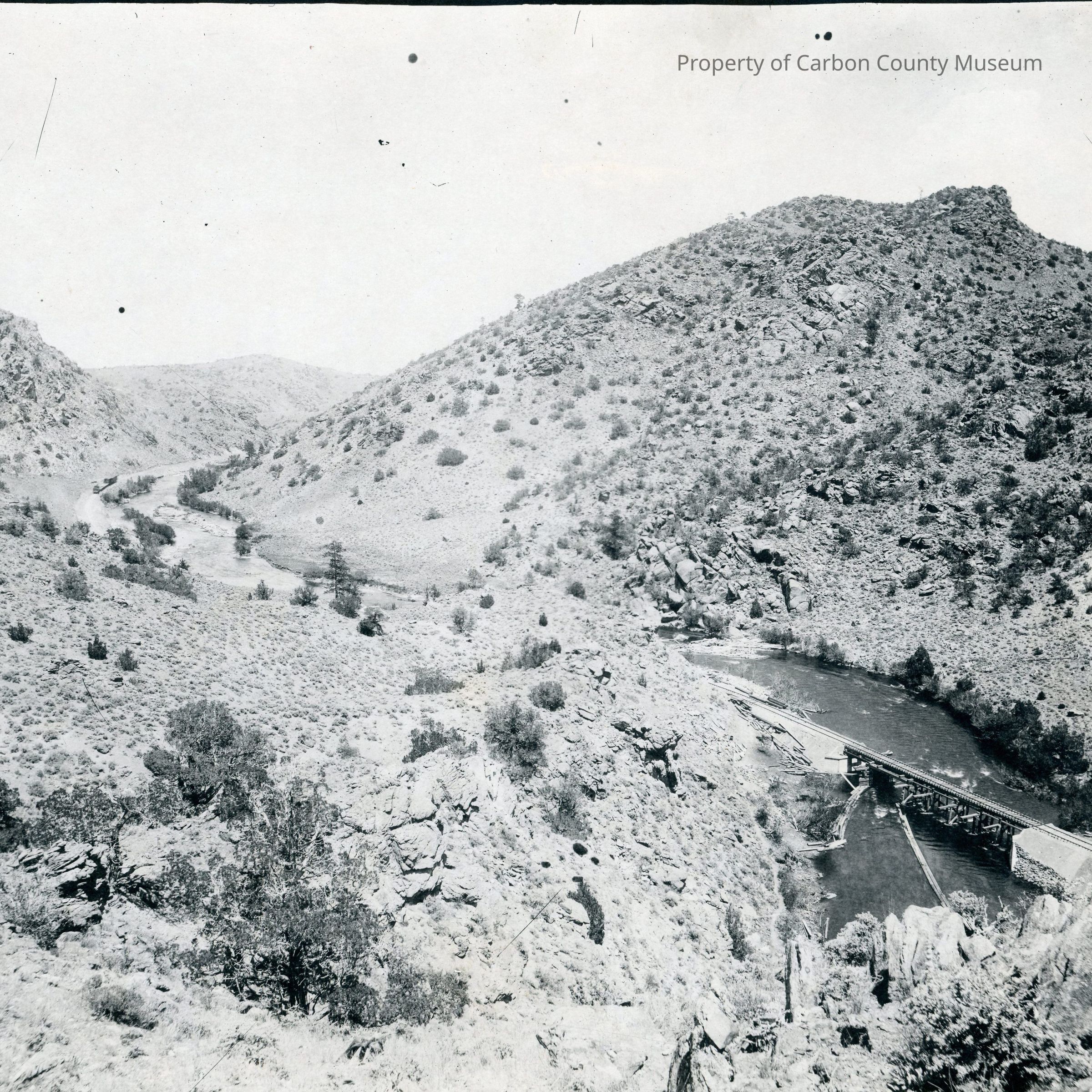 Update 2/2010: Black and white print. Snapshot. Image from above looking down into a river canyon where a railroad track is being constructed along the water's edge. Sagebrush and scrub on rocky hills on either side of river. Bridge has been constructed over the river in the lower right to hold the track.