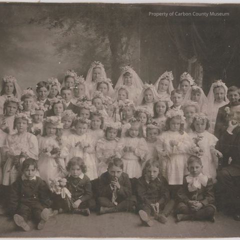 A black and white photograph of a first communion class of 1907 of St. Joseph's Church in Rawlins taken in a studio with a backdrop of clouds and a tree to the right. The first row of children are seated, remaining 6 rows are standing with the minister seated in a chair to the right. Donor's mother, Gertrude Roberts, is the 2nd girl from right on first row standing. Measures 7 1/2" high x 9 3/4".Collection