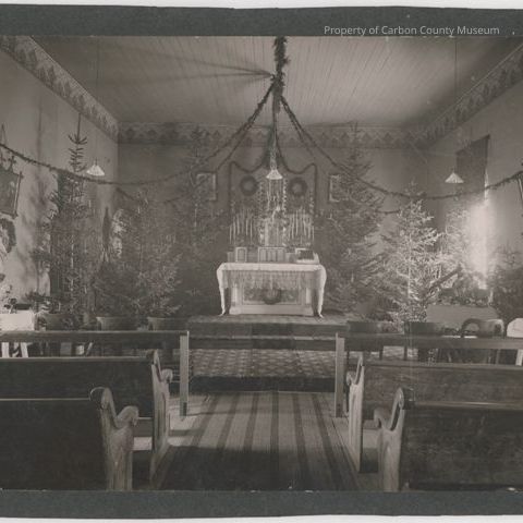 A black and white photograph of the interior of St. Joseph's Church at Christmas time, 1910. Note wooden pews, Christmas trees, high ceilings with paper border along ceiling edge.Collection